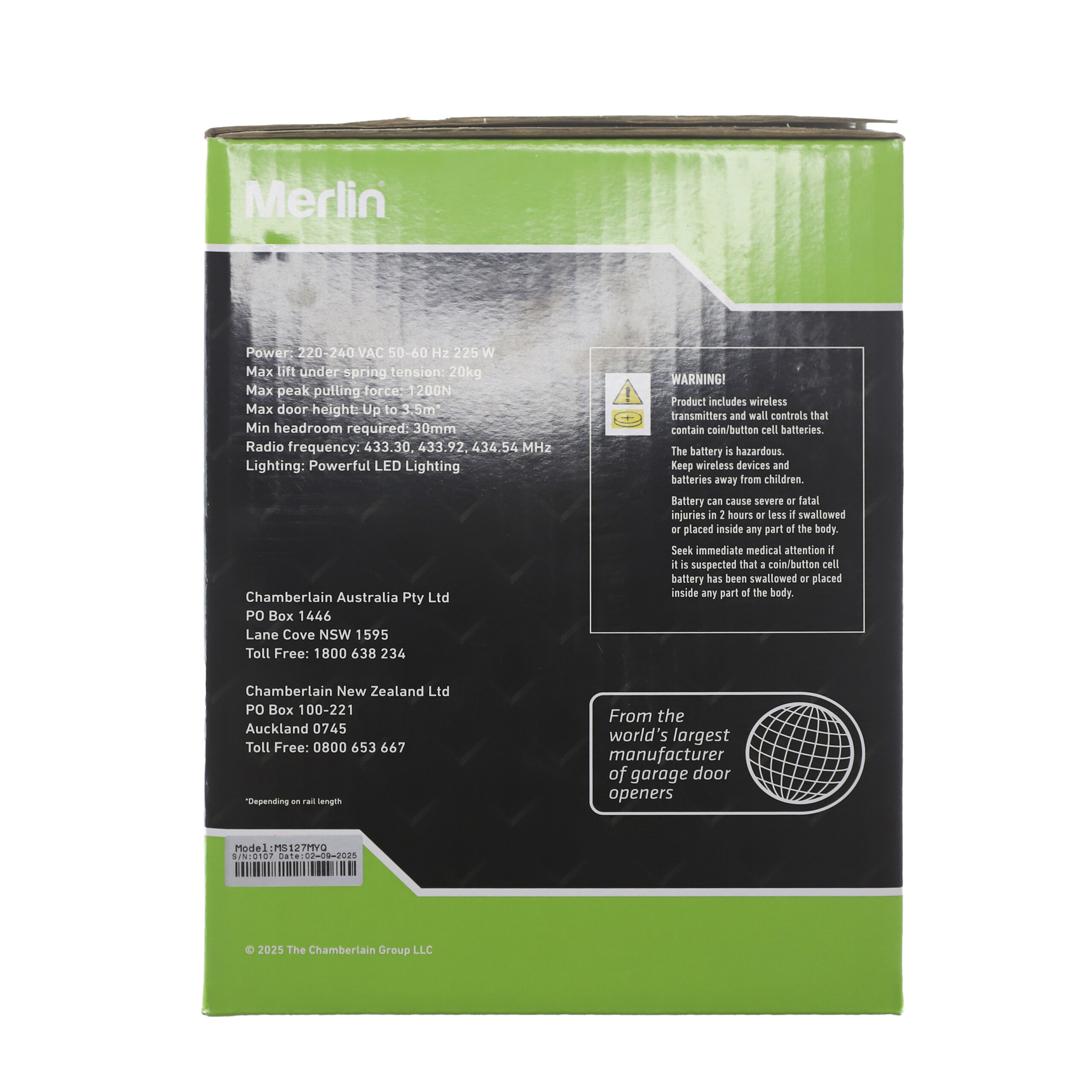 Merlin MS127MYQ Garage Door Opener Specifications